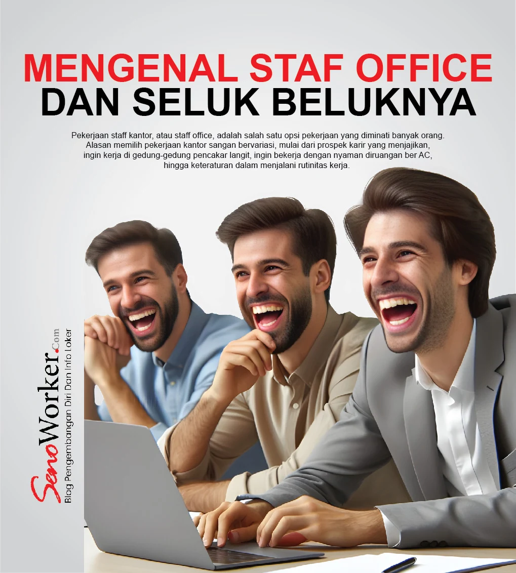 Pekerjaan staff kantor, atau staff office, adalah salah satu opsi pekerjaan yang diminati banyak orang. Alasan memilih pekerjaan kantor sangan bervariasi, mulai dari prospek karir yang menjajikan, ingin kerja di gedung-gedung pencakar langit, ingin bekerja dengan nyaman diruangan ber AC, hingga keteraturan dalam menjalani rutinitas kerja.